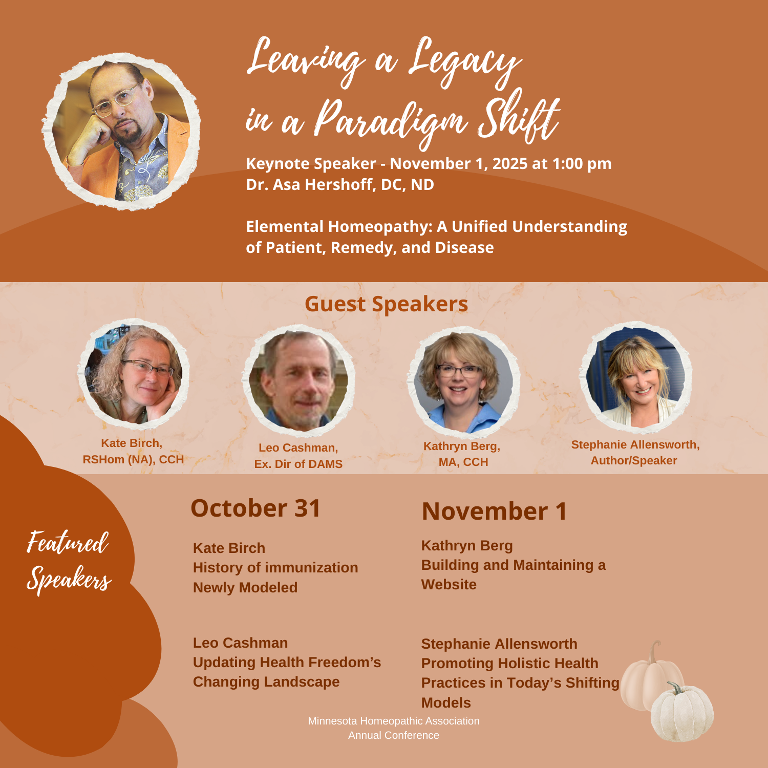 2025 MHA Annual Conference Friday, October 31, 2025 12:30 PM Saturday, November 1, 2025 8:30 AM Minnesota Homeopathic Assocation 7300 Metro Boulevard Edina, MN, 55439 United States (map) Google Calendar ICS Register Now Quick View 2025 MHA Annual Conference Raffle Tickets $20.00 Each attendee will get one raffle ticket with their registration. More information on the exciting raffle prizes coming soon! Add to cart